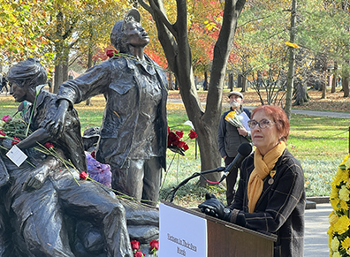 Diane Carlson Evans speaks at the ceremony marking the 30th Anniversary of the Vietnam Women's Memorial (background) on the National Mall in Washington, D.C., November 11, 2023. Evans, who served as a combat nurse in the Vietnam War, founded the memorial after a 10-year campaign. Photo by Eric Minton.