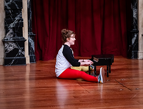 The cast gets through the entire canon before the intermission, but as they count through the list in the play program they’ve borrowed from an audience member, they discover they forgot Hamlet. Hoben decides to abandon the project and runs off with Bennett chasing after her, a bewildering sequence proving to be the script’s only faltering moment that ends the first half and starts the second half. But it does give us a redeeming moment in leaving Babich alone on the stage putting her musical talents on full display playing a toy piano and singing Eric Carmen’s “All By Myself.”