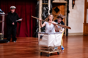 Jenny Bennett (left wearing a captain's hat and bear costume), Ginna Hoben (rowing laundry cart), and Aillie Babich (pushing laundry cart) in American Shakespeare Center's production of The Complete Works of William Shakespeare at the Blackfriars Playouse. Photo by October Grace Media.